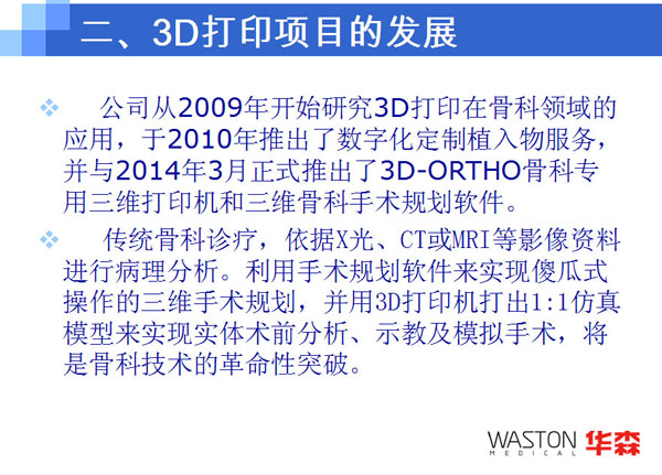 2010年:總額為兩千萬人民幣的二期設(shè)備投資已經(jīng)完成,其中包括更多的五軸加工中心、縱切機(jī)床、車削中心、慢走絲線切割等;與眾多醫(yī)學(xué)、材料學(xué)、力學(xué)等方面的專家以及多家科研機(jī)構(gòu)合作成立常州華森醫(yī)療科技有限公司;華森全球首發(fā)的專利“數(shù)字化定制植入物”經(jīng)過幾年攻關(guān)正式推向市場。
