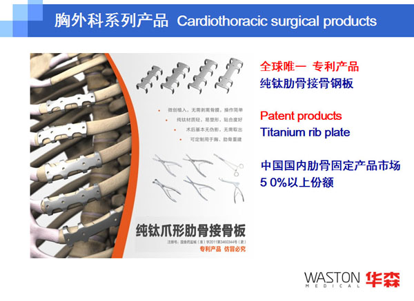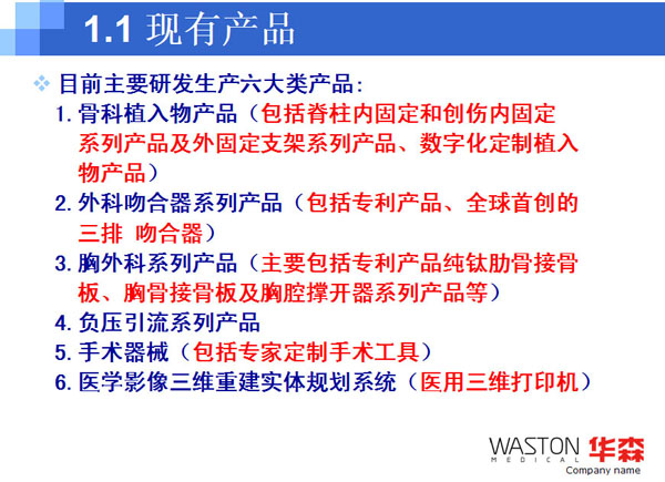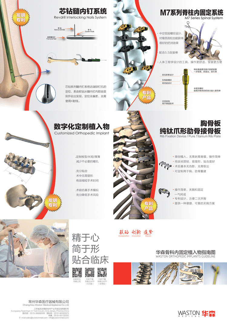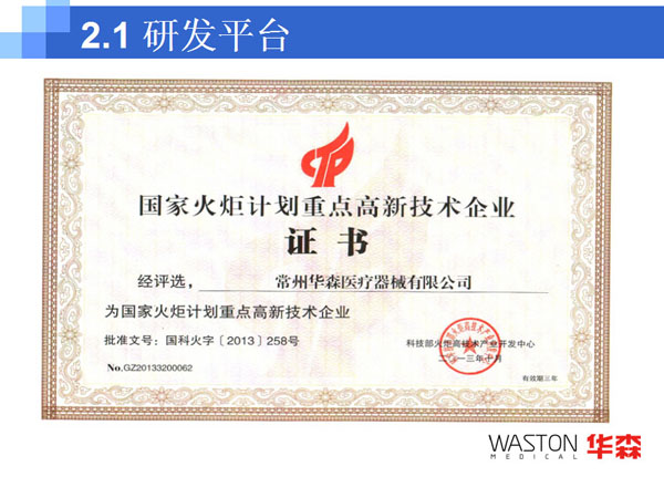 2009年:華森產(chǎn)品已經(jīng)覆蓋整個(gè)中國市場,建立起了一支由七大區(qū)域服務(wù)中心和兩百多家經(jīng)銷商組成的銷售服務(wù)網(wǎng)絡(luò);自有品牌WASTON骨科產(chǎn)品和吻合器產(chǎn)品已經(jīng)進(jìn)入30多個(gè)國家和地區(qū),特別是WASTON吻合器已經(jīng)進(jìn)入歐洲十多個(gè)發(fā)達(dá)國家;在OEM市場,華森已與包括全球前五位的獨(dú)立脊柱產(chǎn)品企業(yè)在內(nèi)的三十多家企業(yè)建立了合作生產(chǎn)關(guān)系;與海歸博士團(tuán)隊(duì)合作成立的常州華森生物科技有限公司正式成立;華森科技創(chuàng)新中心,即華森“三家聯(lián)動(dòng) 科技創(chuàng)新”合作平臺正式成立;
