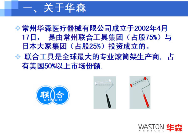 2001年:常州聯(lián)合工具集團(tuán)與日本オーテー株式會(huì)社在國家級常州高新技術(shù)區(qū)發(fā)區(qū)合資成立常州華森醫(yī)療器械有限公司,開始涉足醫(yī)療產(chǎn)業(yè),為集團(tuán)產(chǎn)業(yè)多元化奠定基礎(chǔ);