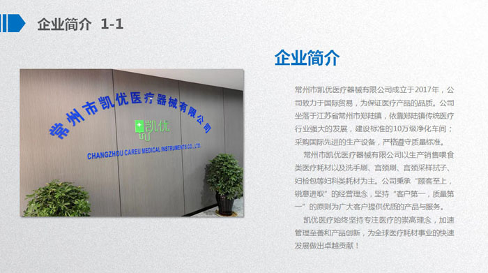 常州市凱優(yōu)醫(yī)療器械有限公司成立于2017年,是一家專注于研究、開發(fā)、生產(chǎn)及銷售喂食類醫(yī)療耗材、醫(yī)用泌尿類耗材、婦科類檢查器械、口罩等產(chǎn)品于一體的現(xiàn)代化企業(yè)。公司坐落于常州市天寧區(qū)鄭陸鎮(zhèn)一天寧高新區(qū)。我們的產(chǎn)品先后通過FDA、CE、ISO等認證。 公司成立至今,始終秉承“顧客至上,銳意進取”的經(jīng)營理念,先后獲得守合同重信用企業(yè)、國家質(zhì)量服務信譽AAA級企業(yè)等榮譽。我們擁有經(jīng)驗豐富的銷售團隊、各類專業(yè)的技術(shù)人才、熟練操作的員工以及數(shù)臺國內(nèi)外先進的設(shè)備,敦力于為客戶提供最優(yōu)質(zhì)的服務和支持。我們以先進的技術(shù)和科學的管理為依托,堅持實施品牌戰(zhàn)略,在競爭激烈的醫(yī)療器械行業(yè)內(nèi),我們注重追求自主設(shè)計研發(fā),己累計推出自主研發(fā)專利十五余項。公司成立短短幾年的時間已經(jīng)實現(xiàn)了跨越式發(fā)展,產(chǎn)品遠銷東南亞、東歐、北美等地區(qū),贏得,國內(nèi)外客戶的一致贊譽。 長風破浪會有時,直掛云帆濟滄海。凱優(yōu)醫(yī)療如同翱翔的雄鷹,迎著希望,展翅飛翔。面對新的機遇與挑戰(zhàn),凱優(yōu)人定會憑借工匠精神,持續(xù)改進、不斷創(chuàng)新,為企業(yè)在激烈的市場競爭中以質(zhì)取勝,確保行業(yè)領(lǐng)先地位,最終實現(xiàn),成為醫(yī)療耗材行業(yè)引領(lǐng)者的企業(yè)愿景。 凱優(yōu)醫(yī)療,因為專注所以卓越。