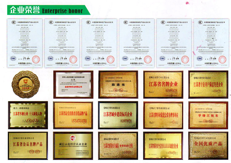 宇鋒車業(yè)獲得工信部摩托車生產(chǎn)企業(yè)資質(zhì), 已有二十多款車型通過工信部目錄公告。宇鋒電動三輪車通過國家CCC認(rèn)證,并由中國人民財產(chǎn)保險股份有限公司承保,有大合格證和車輛一致性證書,宇鋒電動三輪車上牌安全無憂!