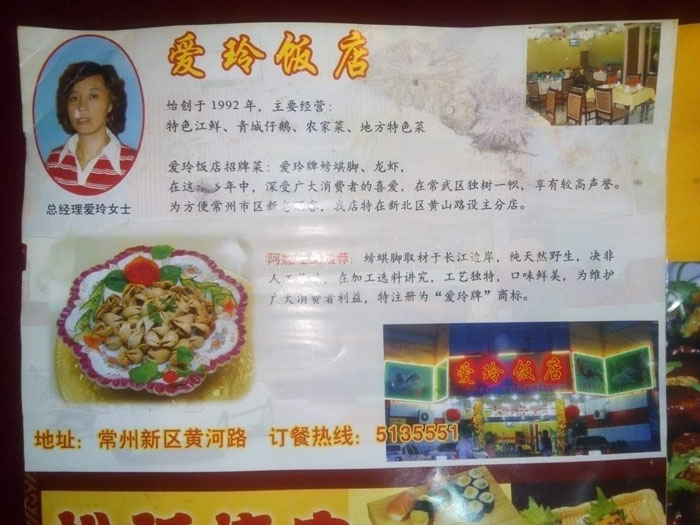 愛玲飯店招牌菜:愛玲牌螃蜞腳、龍蝦,在這十多年中,深受廣大消費者的喜愛,在常武區(qū)獨樹一幟,享有較高聲譽。為方便常州市區(qū)新老客戶,我店在新北區(qū)黃山路設(shè)主分店。
