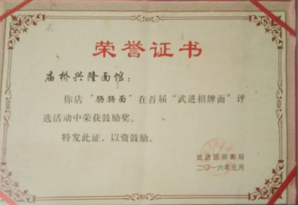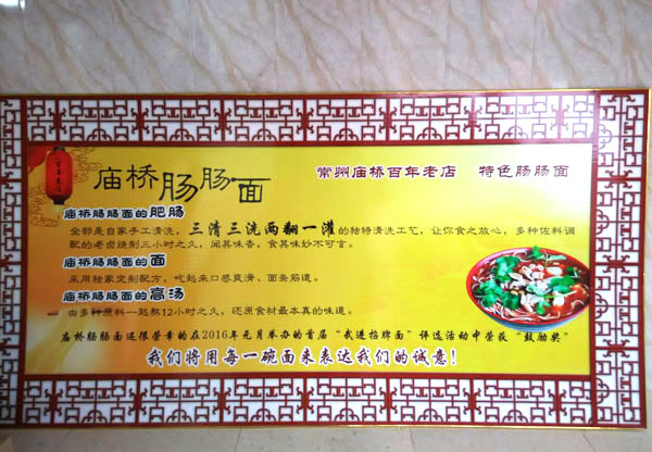 廟橋腸腸面館(原廟橋興隆面館)從事面條軋制及各色蓋澆面的經(jīng)營已有40多年,穿過喧囂的廟橋集鎮(zhèn)區(qū),拐進一條略顯狹窄的道路,兩旁的小吃店突然多了起來,廟橋興隆面館就處在最中間。面館門面并不大,甚至店招牌還有些陳舊,七八張桌子整齊地排在店內(nèi)。面館特色是紅燒腸腸面,現(xiàn)有推出真空包裝腸腸的銷售,面積有100平方米左右。