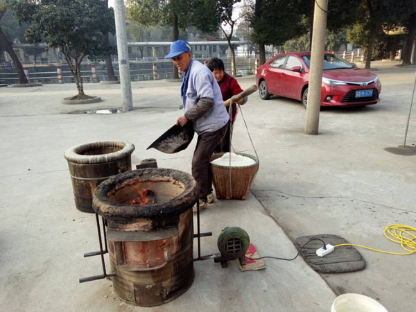 第一步:蒸糯米飯,老徐先用煤爐將水燒開,再將洗凈泡好的糯米放入一只大木桶中,放在爐子上蒸。除此以外,老徐還要不斷攪拌,保證糯米受熱均勻,直至散發(fā)出水蒸氣。為了保證米飯溫度,老徐特地用塑料薄膜將木桶封住,并用皮筋加固。蒸糯米飯,大約需要半個(gè)多小時(shí)。