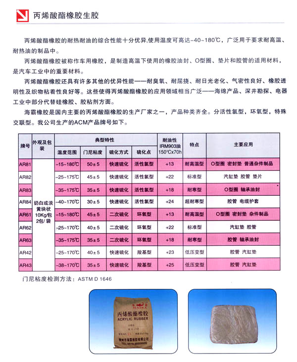 公司生產(chǎn)的聚丙烯酸酯系列橡膠,以及丙烯酸酯橡膠混煉膠、乙烯丙烯酸酯橡膠混煉膠、氟橡膠膠混煉膠、氟硅橡膠混煉膠、氫化丁腈混煉膠等。質(zhì)優(yōu)物美,深得國內(nèi)外客商的青睞。