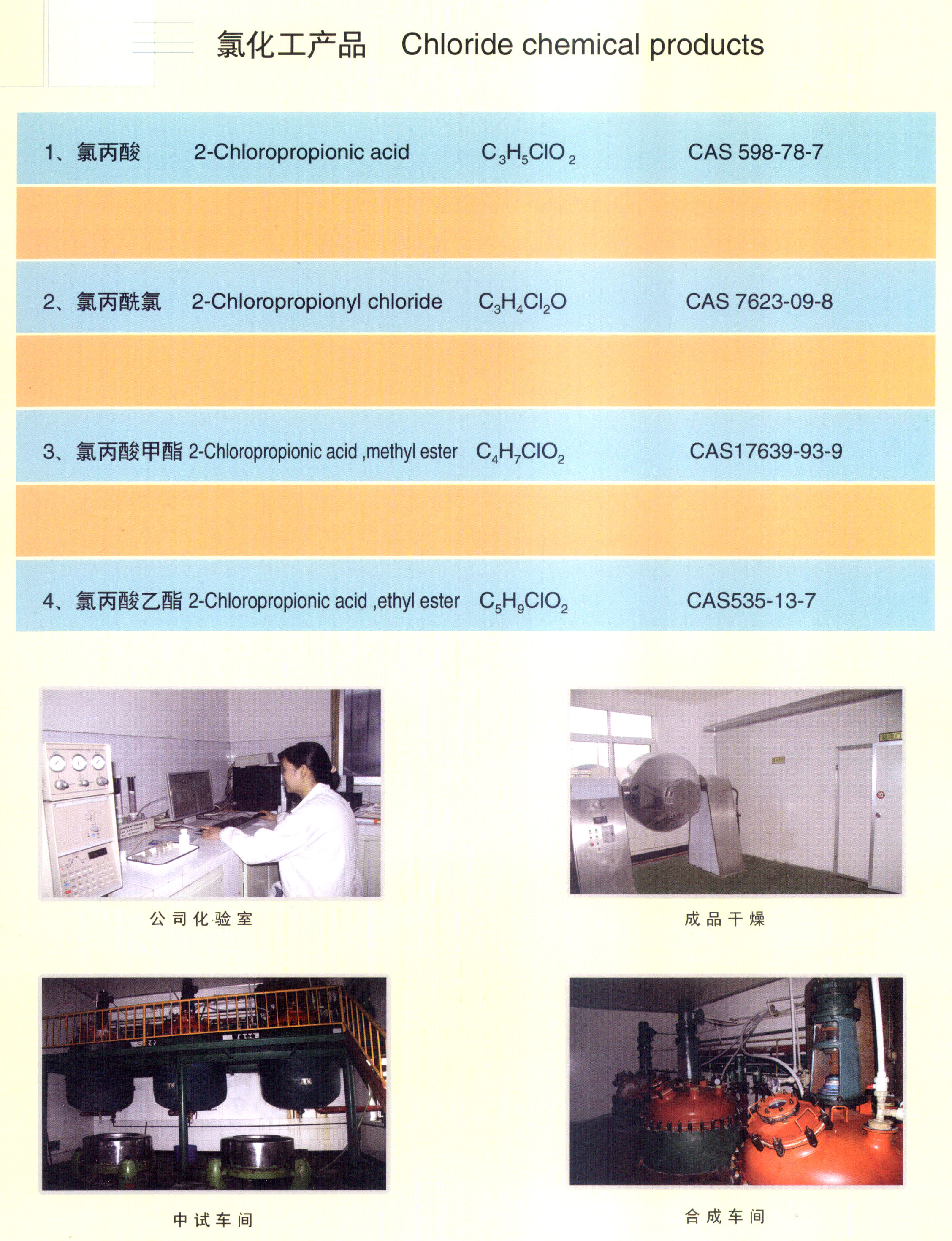 常州市偉強(qiáng)化工有限公司(原武進(jìn)市鄒區(qū)化工廠)創(chuàng)于一九八九年,主要生產(chǎn)經(jīng)營(yíng)精細(xì)化工產(chǎn)品及中間體,形成了生產(chǎn)開發(fā)以丙酸為主要原料的多系列產(chǎn)品格局,目前主要產(chǎn)品有DL-2-丙氨酸、2-氯代丙酸、丙酰氯、2-氯丙酰氯、2-氯丙酸甲酯、2-氯丙酸乙酯、異丁酰氯、丁酰氯、戊酰氯等。 我廠坐落在常州西郊,地理位置優(yōu)越,南有312國道及312省道,北有滬寧高速公路及滬杭大運(yùn)河,交通十分便利.在此,我們將為廣大客戶提供高品質(zhì)的產(chǎn)品及良好的服務(wù),同時(shí)希望能繼續(xù)得到各位新老客戶的支持。 我廠已經(jīng)通過ISO9000質(zhì)量認(rèn)證。 我們將為每位客戶提供高品質(zhì)的產(chǎn)品和一流的服務(wù). 歡迎您的光顧!
