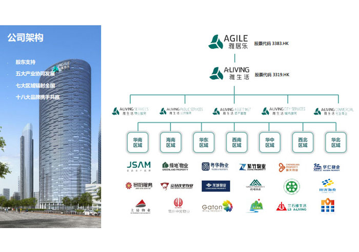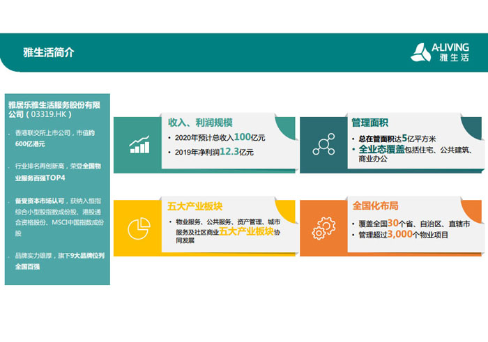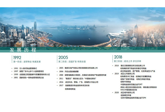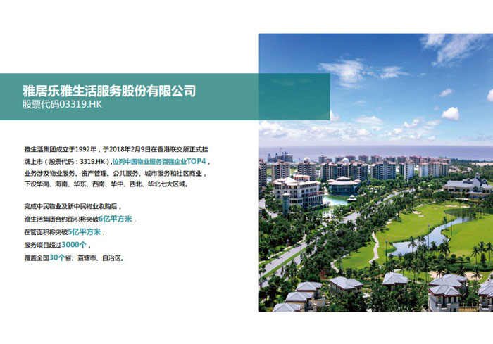 一、立足北上廣,面向全中國,走向全世界 1992年,雅居樂物業(yè)開篇中山,率先引入港式物業(yè)管理模式。1997年,依托雅居樂地產(chǎn)的崛起,連續(xù)接管中山多個項目,成為高端大盤物業(yè)管理的領(lǐng)跑者。1999年,雅居樂物業(yè)開啟專業(yè)化發(fā)展模式,全面通過英國皇家BSI的ISO9000質(zhì)量管理體系認(rèn)證,2001年成為國家首批一級物業(yè)管理資質(zhì)企業(yè)。 2002年,隨著廣州雅居樂花園的盛大啟幕,雅居樂物業(yè)邁開向廣州進(jìn)軍的步伐。為尋求更長遠(yuǎn)的發(fā)展,雅居樂積極構(gòu)思上市藍(lán)圖,2005年在香港成功上市。在深耕珠三角城市群的同時,2006年雅居樂物業(yè)揮師北上,正式開啟全國部署戰(zhàn)略。2008年,接管海南清水灣項目,揭開旅游地產(chǎn)物業(yè)管理的新篇章。 接下來近十年里,雅居樂物業(yè)始終保持著最年輕的成長姿態(tài),依托“管理數(shù)字化、服務(wù)專業(yè)化、流程標(biāo)準(zhǔn)化和操作機(jī)械化”的發(fā)展戰(zhàn)略,雅居樂物業(yè)榮膺2018中國物業(yè)服務(wù)百強(qiáng)企業(yè)第11名,2018年中國物業(yè)服務(wù)百強(qiáng)企業(yè)成長性第二名、2018年中國物業(yè)服務(wù)百強(qiáng)服務(wù)質(zhì)量領(lǐng)先企業(yè)、2018年中國物業(yè)服務(wù)百強(qiáng)滿意度領(lǐng)先企業(yè)、2018中國物業(yè)服務(wù)百強(qiáng)經(jīng)營績效領(lǐng)先企業(yè)、旅游地產(chǎn)物業(yè)管理領(lǐng)先品牌、2018年中國辦公物業(yè)管理優(yōu)秀企業(yè)(綠地物業(yè))、2017中國物業(yè)管理企業(yè)品牌價值第12名、2017中國物業(yè)管理企業(yè)綜合實(shí)力第12名、中國藍(lán)籌物業(yè)企業(yè)、《旅游地產(chǎn)物業(yè)管理服務(wù)標(biāo)準(zhǔn)》(團(tuán)體標(biāo)準(zhǔn))起草工作等多項殊榮。 目前,雅生活集團(tuán)已形成廣州、中山、深圳、南京、上海、西安、成都、海南、云南、北京、鄭州、南寧、沈陽、武漢、馬來西亞十五大城市公司全面發(fā)展的蓬勃態(tài)勢。截止2017年12月31日,雅生活集團(tuán)管理范圍覆蓋全國逾69座城市與地區(qū),服務(wù)類型涵蓋主流住宅、高端豪宅、旅游地產(chǎn)、商業(yè)、寫字樓等多種業(yè)態(tài),合約總建筑面積為12610萬平方米,擁有200多個項目,服務(wù)業(yè)主逾100萬人。 2017年6月,雅生活集團(tuán)收購綠地物業(yè)100%股權(quán),并與綠地集團(tuán)簽署戰(zhàn)略合作協(xié)議,8月,綠地集團(tuán)投資10億元獲得雅生活集團(tuán)20%股權(quán)。未來,雅生活集團(tuán)將實(shí)施“雅居樂物業(yè)”與“綠地物業(yè)”雙品牌驅(qū)動戰(zhàn)略,還將尋求在A股上市,力爭打造中國物業(yè)“A+H”第一股。