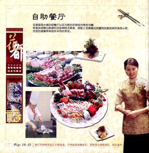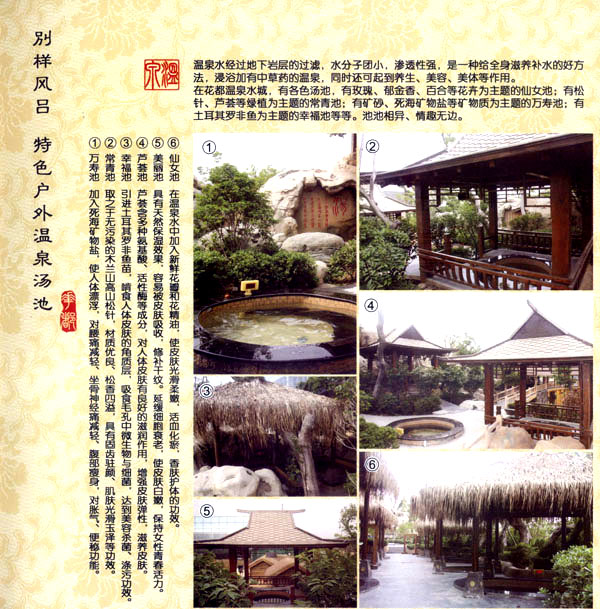 淹城花都溫泉水城孕育天地之精華,悅身、悅?cè)荨傂、悅神。置身其中泉水潺潺,霧氣繚繞、花瓣飄香,恍若仙境!稗渌略谑,弄花香滿衣”,花都溫泉的浪漫與溫潤在這里完美展現(xiàn)。 花都溫泉水城包括洗浴區(qū)、戲水世界、露天溫泉、自助餐廳、生態(tài)房、別墅區(qū)、紅文化房、VIP區(qū)等多種功能區(qū)域,是集溫泉養(yǎng)生、休閑住宿、演藝會(huì)務(wù)為—體的休閑度假勝地,給賓客帶來江南小鎮(zhèn)的浪漫水城之旅。 古木新枝畔賓客對(duì)酒當(dāng)歌,溪泉石椅旁把茶品啜。 淹城-三勤生態(tài)酒店,這里是一處綠色生態(tài)的美食家園。此地鬼斧神工.奇水異石,和風(fēng)細(xì)雨林中穿過,引百鳥朝來暮歌;這里集生態(tài)餐飲、演藝、中小型會(huì)務(wù)為一體,將現(xiàn)代裝飾風(fēng)格和古雅拙樸的自然裝修完美整合;這里聚集大江南北名廚,推出精致綠色美昧佳肴。來到這里,賓客可享田園至美之景,品舌尖至鮮之味,實(shí)乃人生一大樂事。
