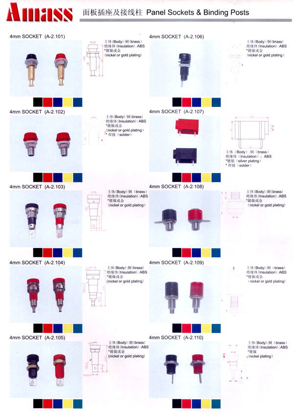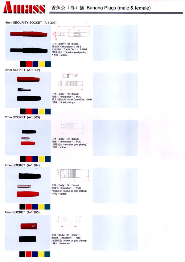 本公司專業(yè)生產(chǎn)各類香蕉插頭,香蕉插座,接線柱,電瓶夾,鱷魚夾,測試導(dǎo)線,測試筆等。產(chǎn)品分2mm/2.5mm/3mm/3.5mm/4mm五大系列,百余種款式, 各種香蕉插廣泛用于儀器、儀表、電力測試、教學(xué)、玩具,視聽設(shè)備、醫(yī)療儀器,保健產(chǎn)品等領(lǐng)域。公司技術(shù)力量雄厚,生產(chǎn)工藝先進(jìn),產(chǎn)品遠(yuǎn)銷港、臺、歐美,并與飛利浦等國際品牌配套。公司本著精益求精的理念,歡迎新老客戶光臨。