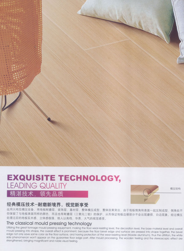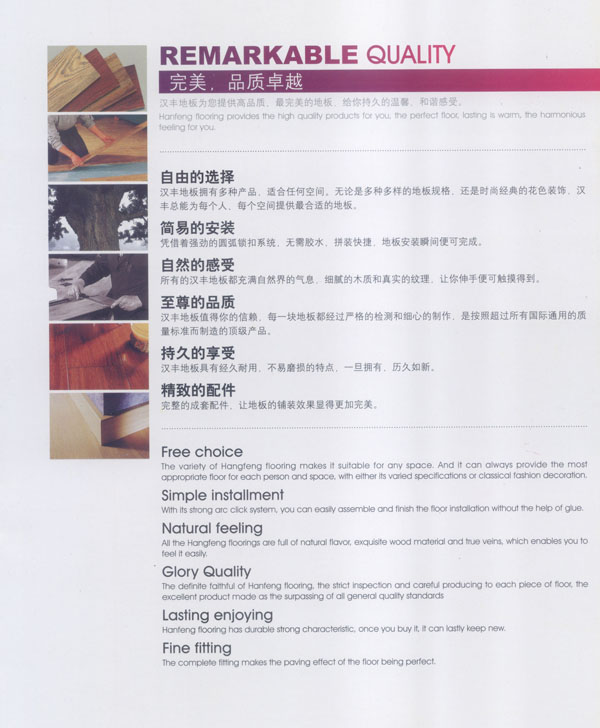 漢豐地板以奉獻生活中最完美的地板為發(fā)展目標,時尚流行的設計風格和多樣化的產品類型,贏得了市場的廣泛贊譽和肯定。產品嚴格按照歐洲標準檢測強化木地板的各項性能指標.達到百分百的國際技術標準,確保了每一塊地板都有著上乘品質,是綠色環(huán)保的好地板。并先后通過了Isc)9001國際質量管理體系認證,IS014001國際環(huán)境管理體系認證.中國環(huán)境標志產品認證,深得用戶的一致好評,是寫字樓、商場、大型超市、學校、建筑樓宇、娛樂場所、家用私宅等鋪裝的首選地板。