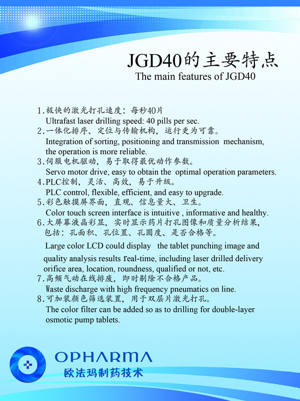 公司始建以來,以前瞻的科學(xué)規(guī)劃,通過自主研發(fā),解決了高速激光打孔機(jī)諸多的世界難題,使之達(dá)到40片/秒以上且精確打孔的國際領(lǐng)先水平;同時(shí)開發(fā)廢片自動(dòng)識(shí)別、剔除功能,以滿足客戶的實(shí)際所需。公司與瑞士等國家研究機(jī)構(gòu)的科技合作,以高速激光打孔機(jī)為基礎(chǔ),建設(shè)了滲透泵制劑研發(fā)和中試生產(chǎn)車間,開發(fā)了多種藥物的滲透泵制劑,形成了從關(guān)鍵設(shè)備研制,新制劑開發(fā)、工藝配套,到批量生產(chǎn)測(cè)試的滲透泵制劑開發(fā)全過程技術(shù)團(tuán)隊(duì)和研究設(shè)施。公司瞄準(zhǔn)現(xiàn)代新型釋藥系統(tǒng),吸收國內(nèi)外高端人才,努力開拓控緩釋技術(shù)、靶向給藥技術(shù)及智能給藥技術(shù)。