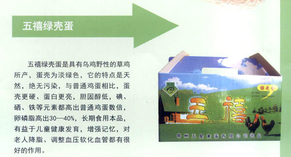 經(jīng)多年努力實現(xiàn)了“五禧”產(chǎn)品系列化,F(xiàn)公司每年向市場提供有“五禧”鮮雞蛋,“五禧”土雞蛋,“五禧”ELC蛋,“五禧”綠殼草雞蛋,成為了不同消費群體的理想選擇。“五禧”蛋多次榮獲常州市場知名商標稱號。