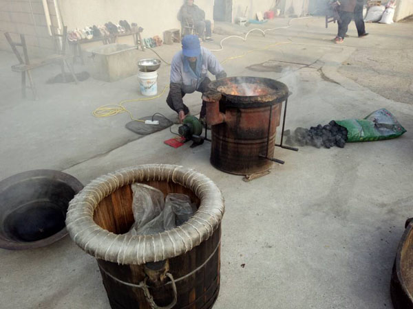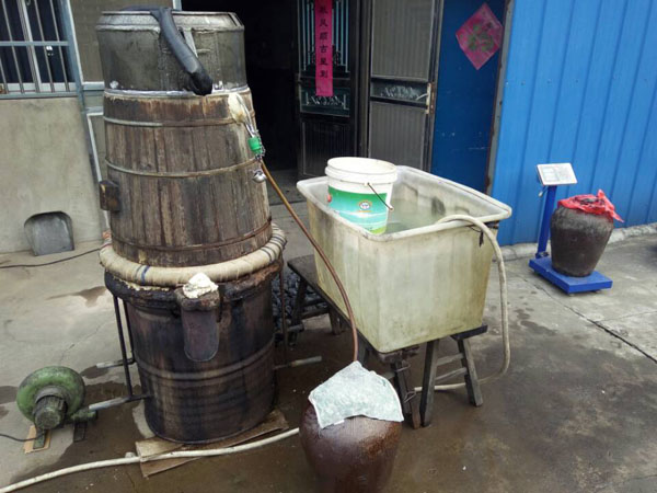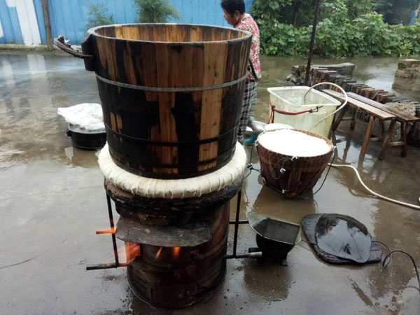 第四步:放入缸中,酒曲和糯米拌好后,便可放入屋內(nèi)的大缸中,并在其中挖出個圓形的洞,放入竹筒做酒窩。在此之前,大缸可用之前冷卻糯米飯的溫水擦一擦暖缸,這樣更有益于酒曲發(fā)酵。為了保證酒曲發(fā)酵的溫度,還要給酒料附上塑料薄膜。若是氣溫低于零度,還得多蓋上幾層棉被才行。像池阿姨家的400斤糯米,老徐至少要重復(fù)這些步驟八遍!大缸中的酒料大約發(fā)酵了10天左右,在酒乳已非常豐富之際,按照1:1的比例,打開封口加入冷開水,然后再蓋上棉被。繼續(xù)放置45天后,米酒才算大功告成!如果覺得米酒不過癮,老徐還會將米酒吊成燒酒,也就是白酒,依舊是傳統(tǒng)的老手藝。未來某天,TA會消失 ,其實(shí),做米酒的方法并不難,幾乎是以前家家戶戶的必備技能。然而現(xiàn)如今,不僅老常州們不再自己做酒,就連像老徐這樣的做米酒手藝人也越來越少。就連跟了老徐三十多年的一套米酒家當(dāng),也同樣經(jīng)不起歲月:鐵鍋漏了要去找橫山橋的老師傅;木桶壞了要去禮嘉修;爐子也有專門的式樣,過幾年就要拿著圖紙找人翻新......