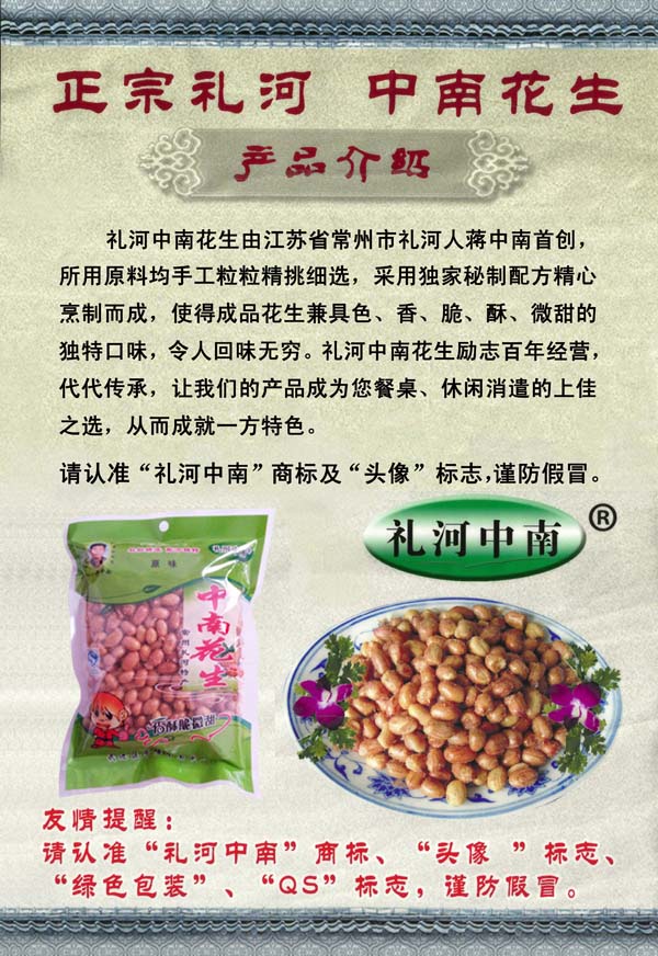 武進區(qū)牛塘中南食品廠的是由原“禮河中南”花生發(fā)展而成。"禮河中南"花生由常州禮河人蔣中南首創(chuàng)。所采用的花生,選用優(yōu)質(zhì)的產(chǎn)地,經(jīng)過人工精心挑選,把不規(guī)則的粒子去掉,加上獨家的配方和精工制作,使花生香、酥、脆、微甜。獨特的口味,令人吃了回味無窮,在常武地區(qū)享有盛譽、暢銷不衰。 隨著“禮河中南“花生在常武地區(qū)的暢銷,企業(yè)不斷的發(fā)展壯大,逐漸發(fā)展成為一個專業(yè)生產(chǎn)加工油炸花生的公司,擁有完整、科學(xué)的質(zhì)量管理體系。武進牛塘中南花生食品廠設(shè)備齊全、環(huán)境干凈整潔、資質(zhì)齊全,企業(yè)的誠信、實力和產(chǎn)品質(zhì)量獲得業(yè)界的認(rèn)可。 正宗的中南花生為綠色包裝,包裝上有“禮河中南”花生創(chuàng)始人蔣中南先生的頭像以及QS生產(chǎn)許可標(biāo)志,請廣大客戶認(rèn)準(zhǔn)購買,以防假冒。 歡迎各界朋友蒞臨參觀、指導(dǎo)和業(yè)務(wù)洽談。 制造商:常州市武進區(qū)牛塘中南食品廠 銷售店:常州市武進區(qū)禮河聚新家園商業(yè)街12-8號 常州市武進區(qū)湖塘鎮(zhèn)東方路53號(陸家橋西側(cè))