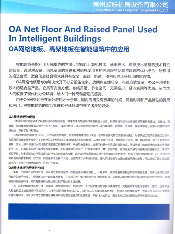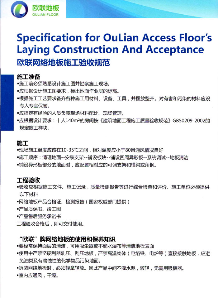防靜電高架活動地板、全鋼地板、陶瓷地板是計算機行業(yè)發(fā)展起來的新型鋪地材料,隔離了潮氣、靜電灰塵,最重要的是解決了綜合布線問題,無需預(yù)埋管線,可隨時拆卸、搬移,保證了資訊設(shè)備完整的優(yōu)點,適應(yīng)了智能化樓宇中信息自動化技術(shù)對所處環(huán)境的特定要求,避免了廣大客戶的雙重投資,使現(xiàn)代化辦公程度更加高效,辦公場所更加舒適。 “歐聯(lián)”系列全鋼地板,符合國家安全要求,種類完備多樣,其中防靜電陶瓷地板、硫酸鈣地板等除具有普通瓷質(zhì)的裝飾和實用性外,其耐磨、防水、防火功能優(yōu)于其它同類產(chǎn)品,防靜電系列地板,能切合不同客戶的要求,其靈活的配置,深受客戶歡迎,不同材質(zhì)的地板結(jié)構(gòu)使設(shè)計師的設(shè)計空間比傳統(tǒng)的更加廣闊自由和善變。 公司大力發(fā)展國內(nèi)外銷售業(yè)務(wù),多次中標(biāo)國內(nèi)重點工程 ,例:哈爾濱醫(yī)科大學(xué)、山東大學(xué)、上海普通機場等。 公司將一如既往開發(fā)和制造一流的產(chǎn)品,愿與廣大有識之士合作發(fā)展,共創(chuàng)美好未來。